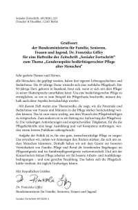 Grußwort der Bundesministerin für Familie, Senioren, Frauen und Jugend, Dr. Franziska Giffey für eine Heftreihe der Zeitschrift „Sozialer Fortschritt“ zum Thema „Genderaspekte bedürfnisgerechter Pflege alter Menschen“