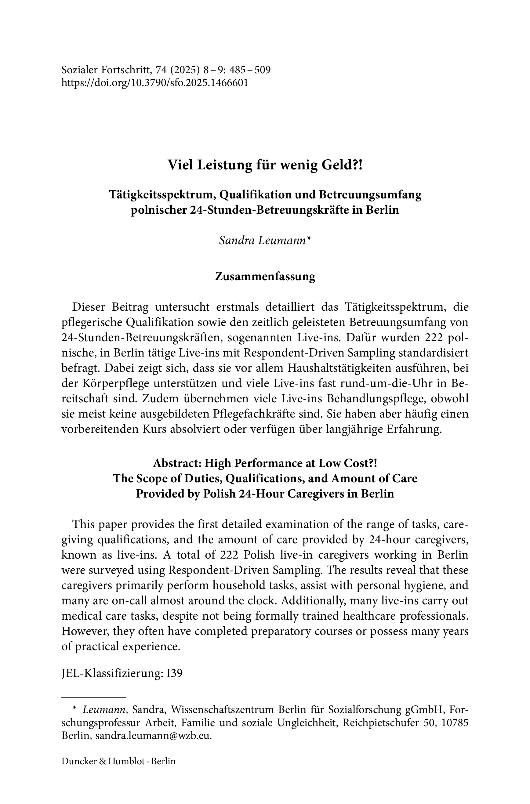 Tätigkeitsspektrum, Qualifikation und Betreuungsumfang polnischer 24-Stunden-Betreuungskräfte in BerlinSozialer Fortschritt, Vol. 74 (2025), Iss. 8–9 : pp. 485–509 | First published online: September 11, 2025