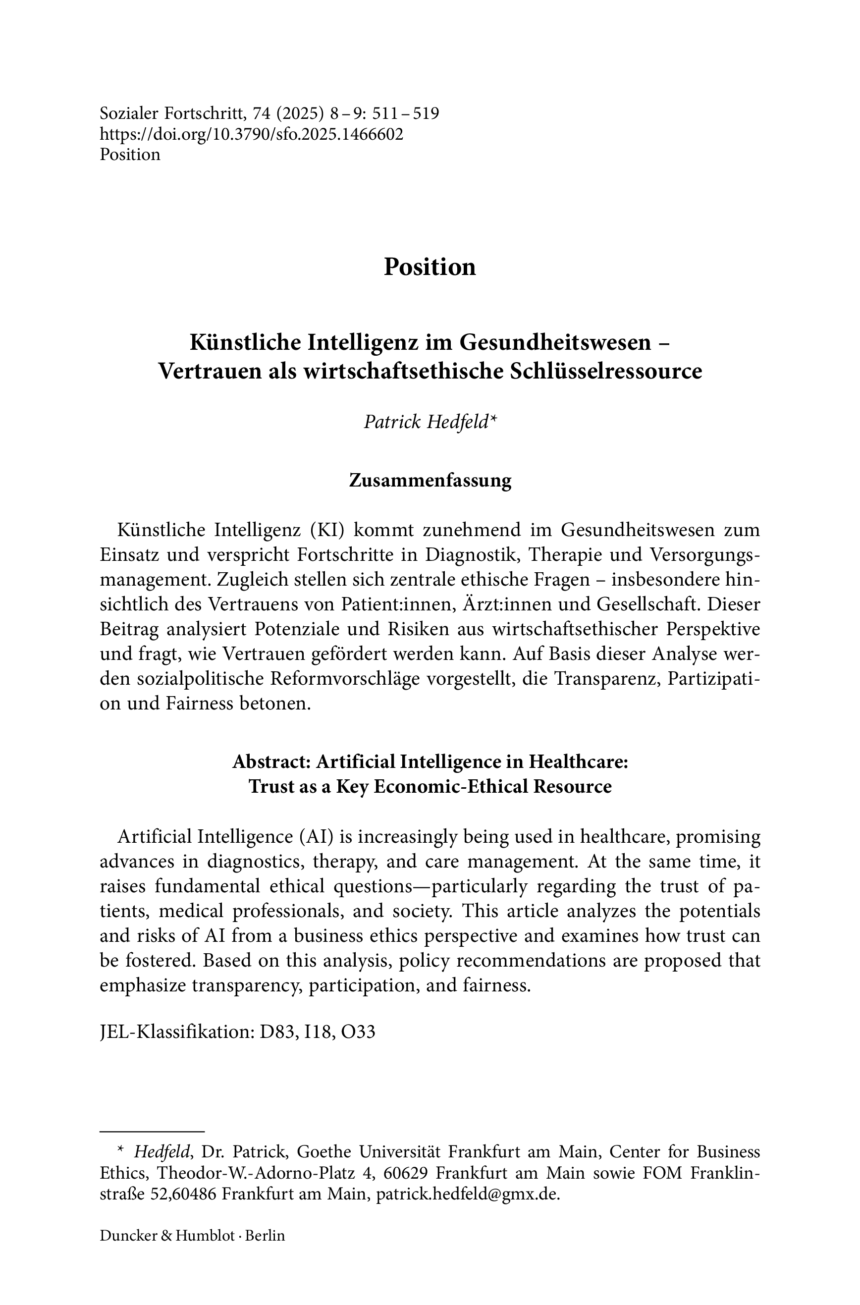 Künstliche Intelligenz im Gesundheitswesen – Vertrauen als wirtschaftsethische Schlüsselressource