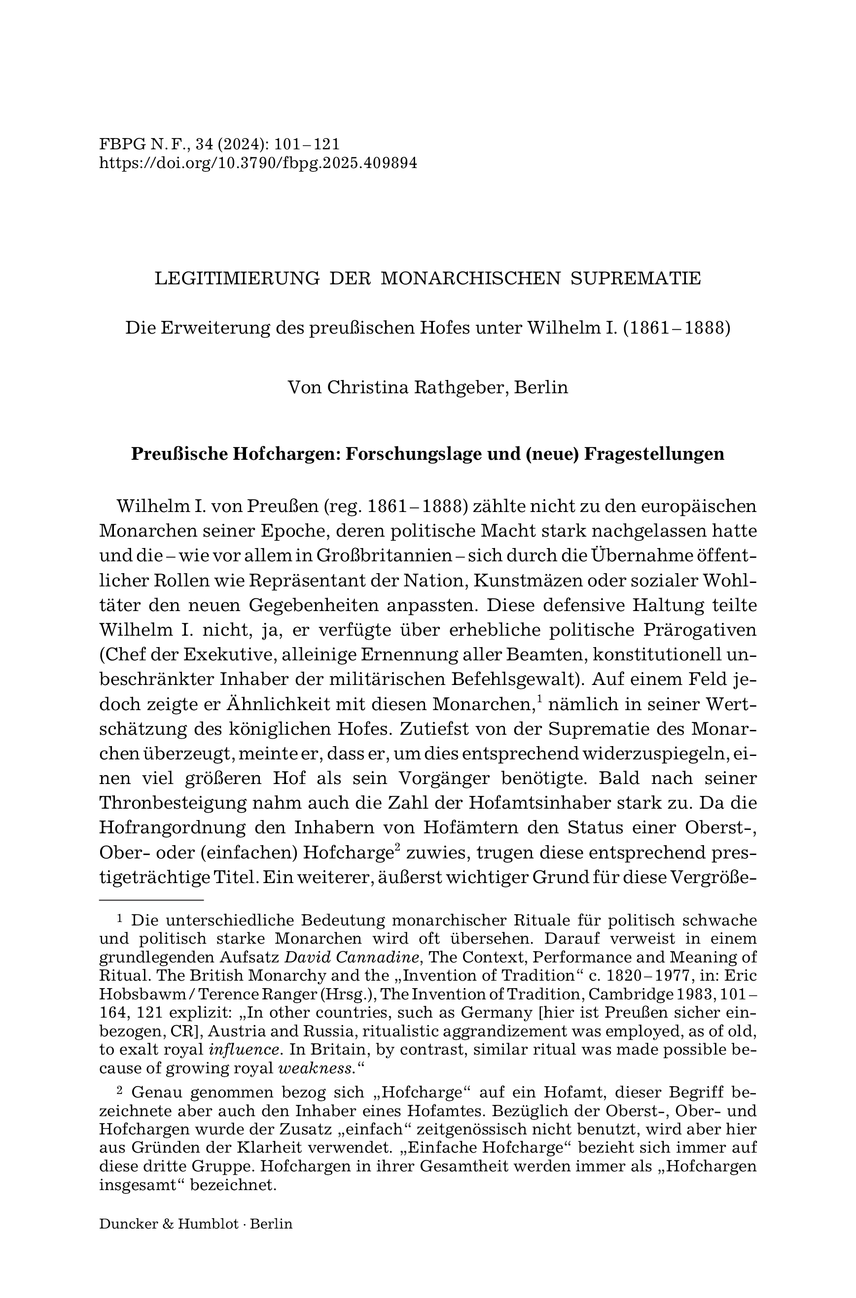 Die Erweiterung des preußischen Hofes unter Wilhelm I. (1861 – 1888)Forschungen zur Brandenburgischen und Preußischen Geschichte, Vol. 34 (2024), Iss. 1 : pp. 101–122 | First published online: October 01, 2025