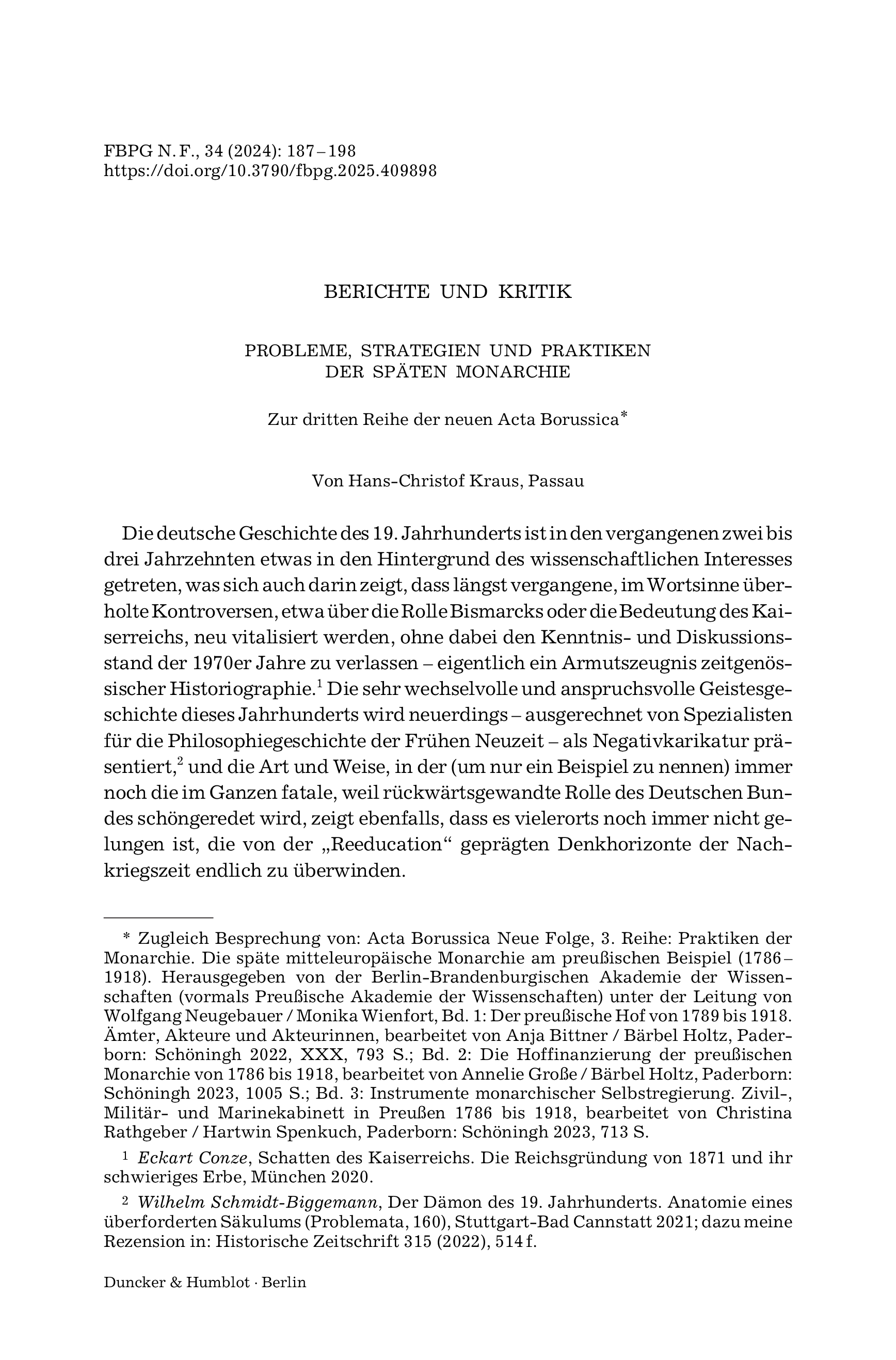 Zur dritten Reihe der neuen Acta BorussicaForschungen zur Brandenburgischen und Preußischen Geschichte, Vol. 34 (2024), Iss. 1 : pp. 187–198 | First published online: October 01, 2025