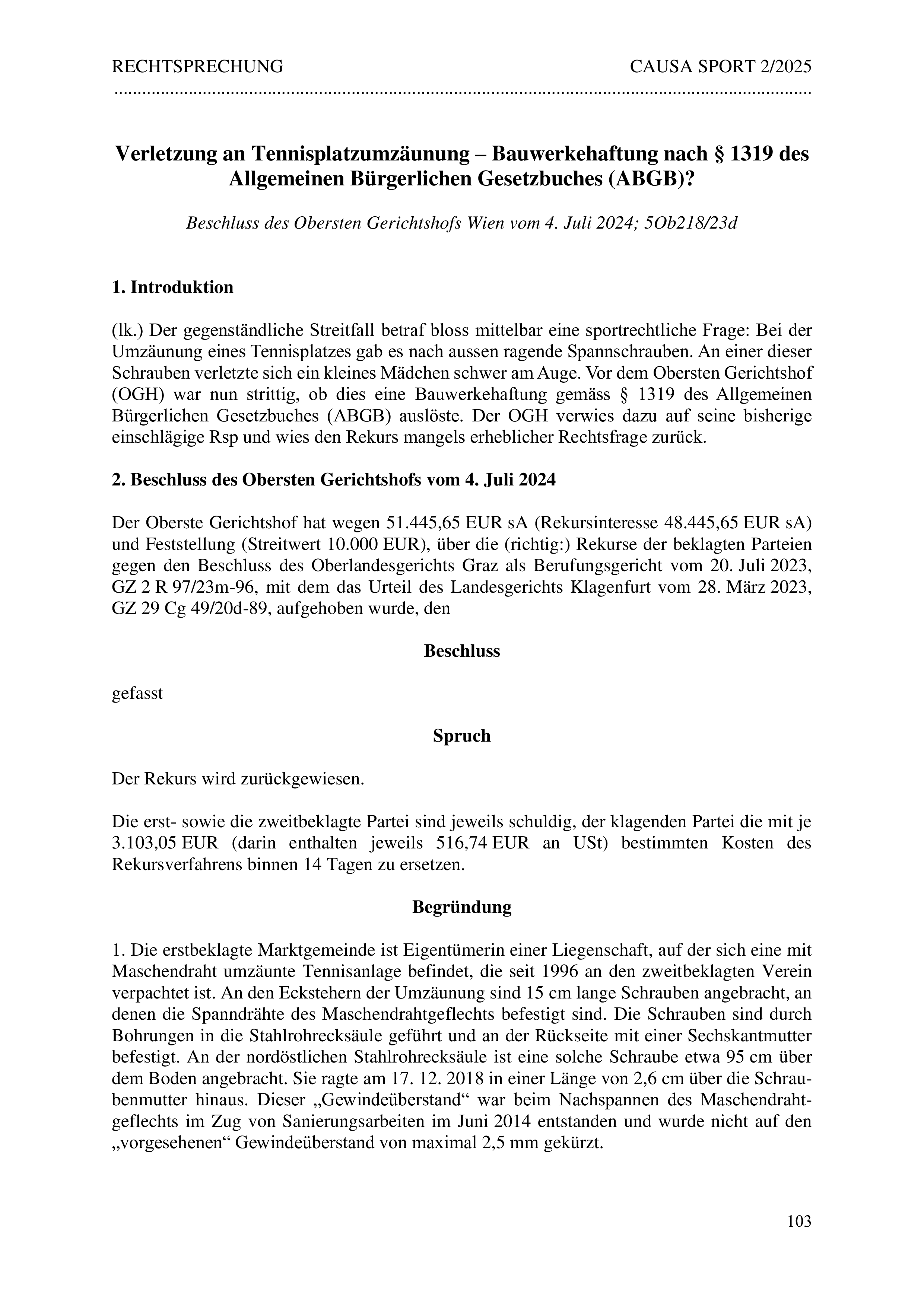 Verletzung an Tennisplatzumzäunung – Bauwerkehaftung nach § 1319 des Allgemeinen Bürgerlichen Gesetzbuches (ABGB)?