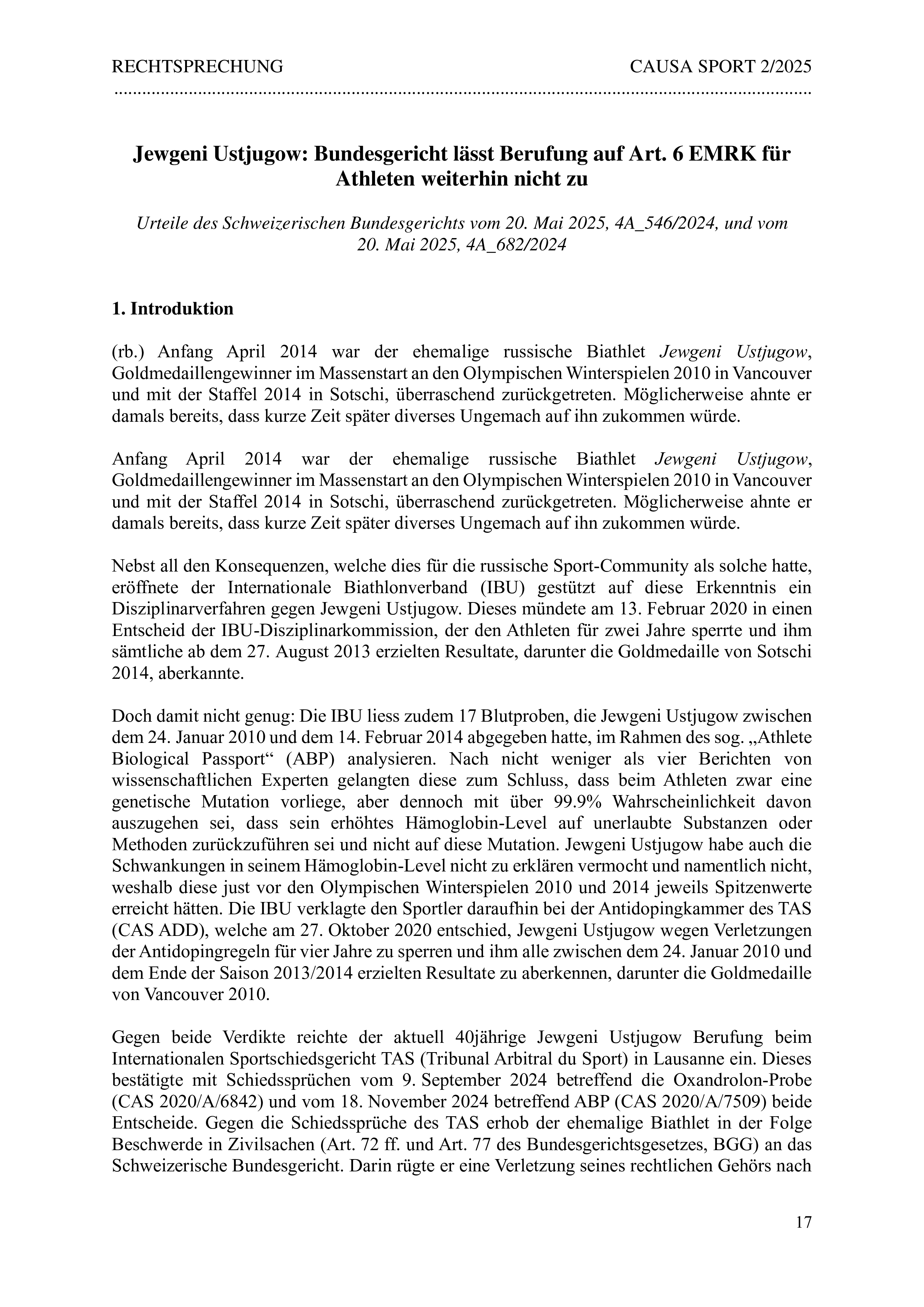 Jewgeni Ustjugow: Bundesgericht lässt Berufung auf Art. 6 EMRK für Athleten weiterhin nicht zu