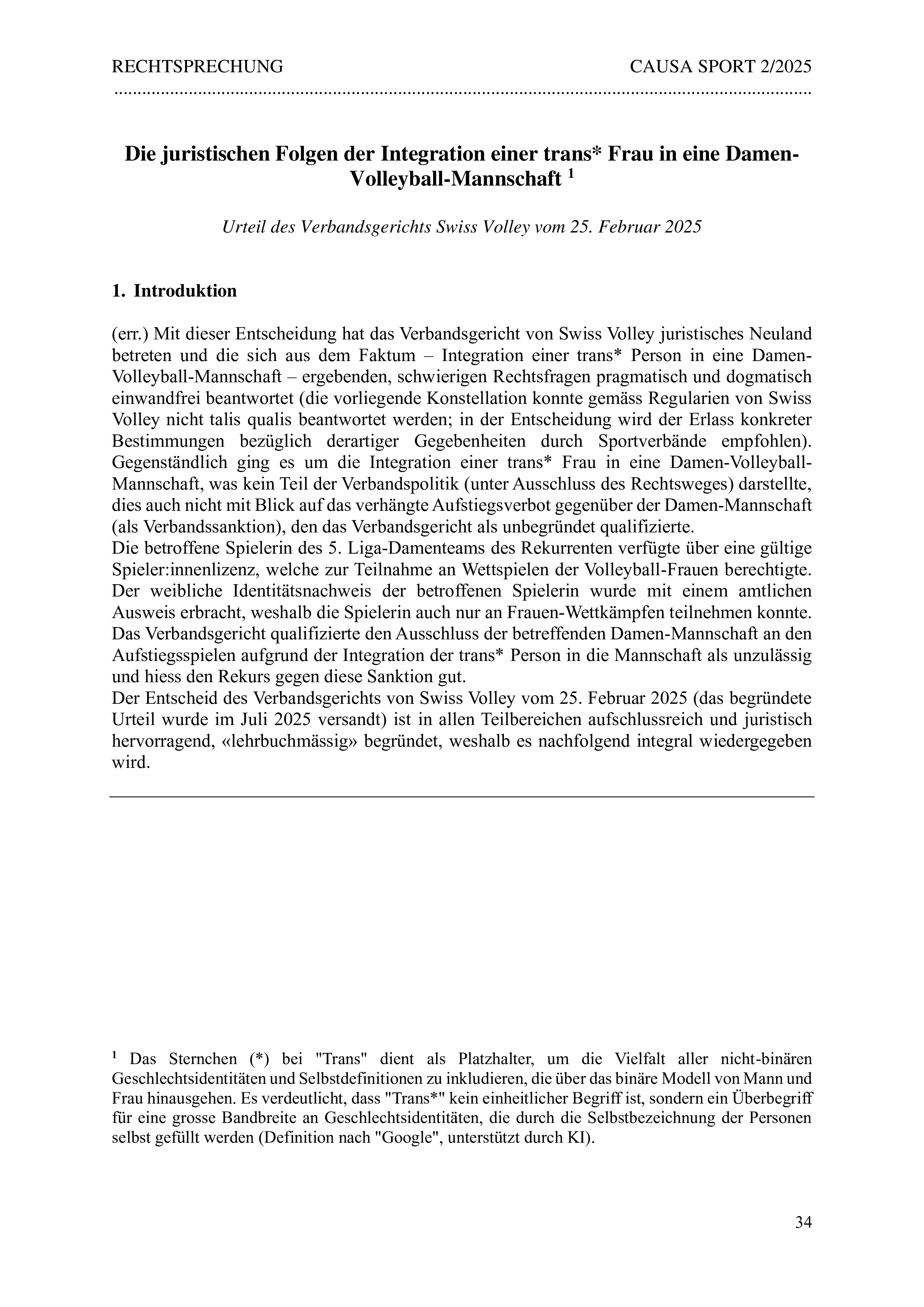 Die juristischen Folgen der Integration einer trans* Frau in eine Damen-Volleyball-Mannschaft