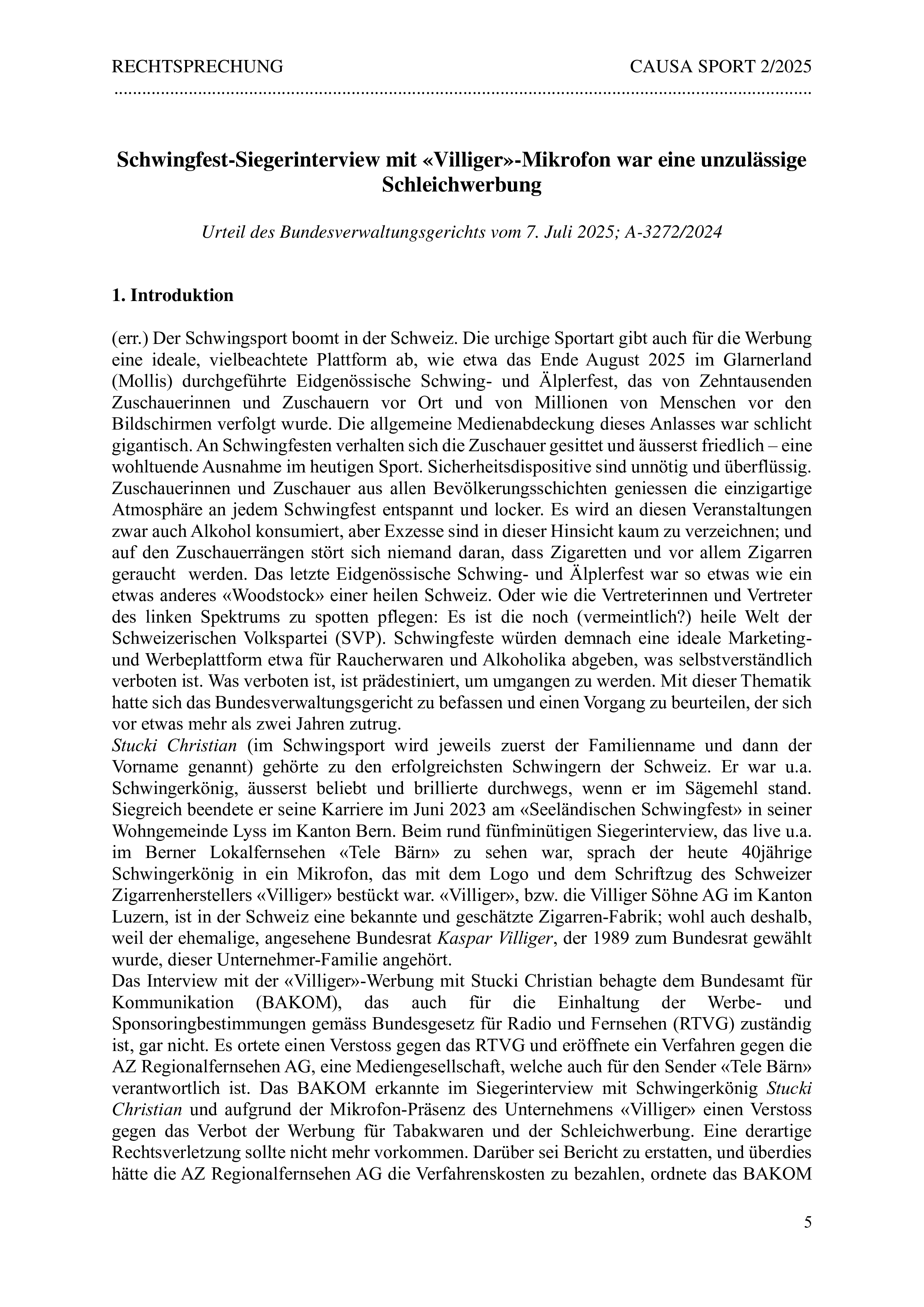 Schwingfest-Siegerinterview mit "Villiger"-Mikrofon war eine unzulässige Schleichwerbung