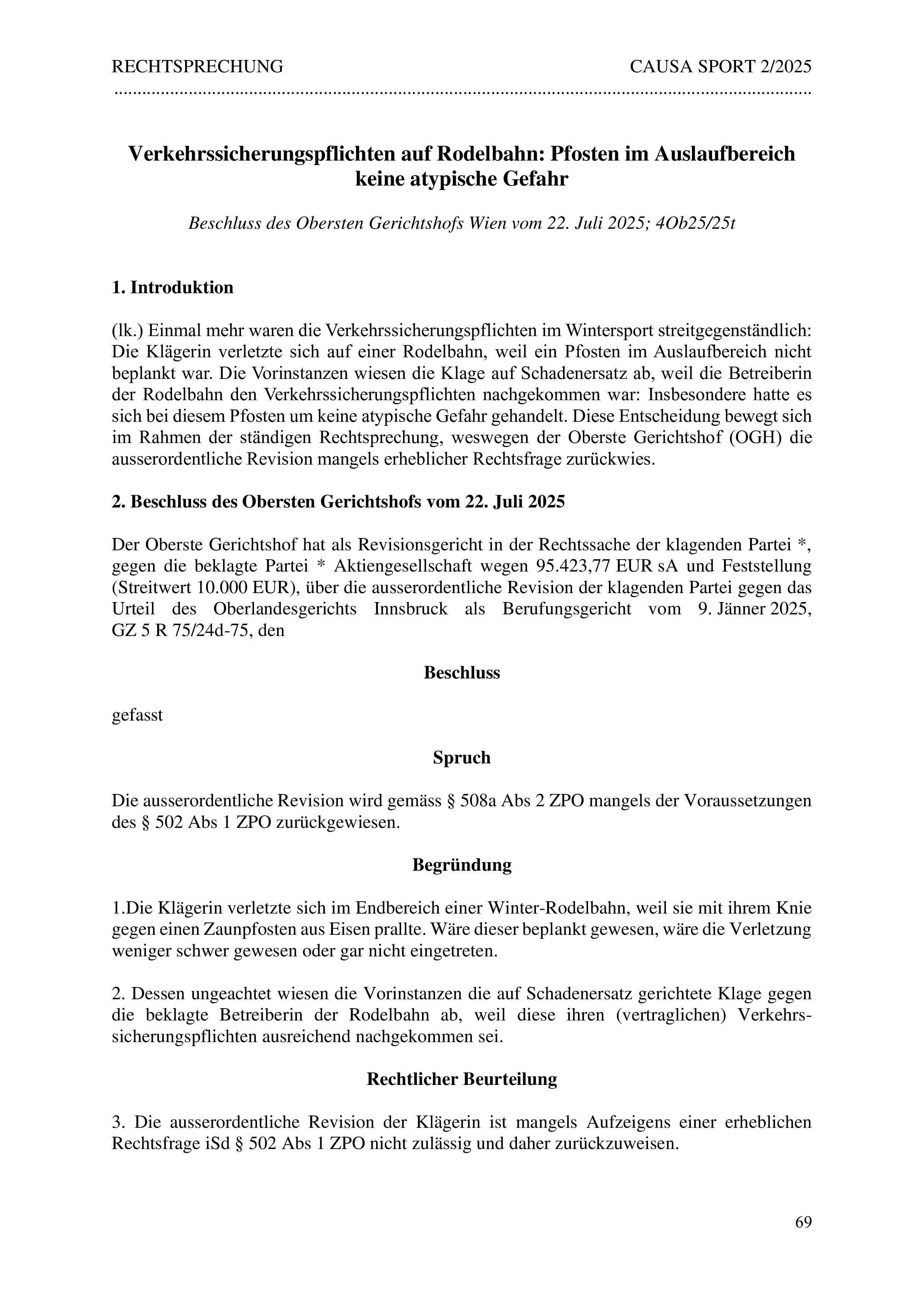 Verkehrssicherungspflichten auf Rodelbahnen: Pfosten im Auslaufbereich keine atypische Gefahr