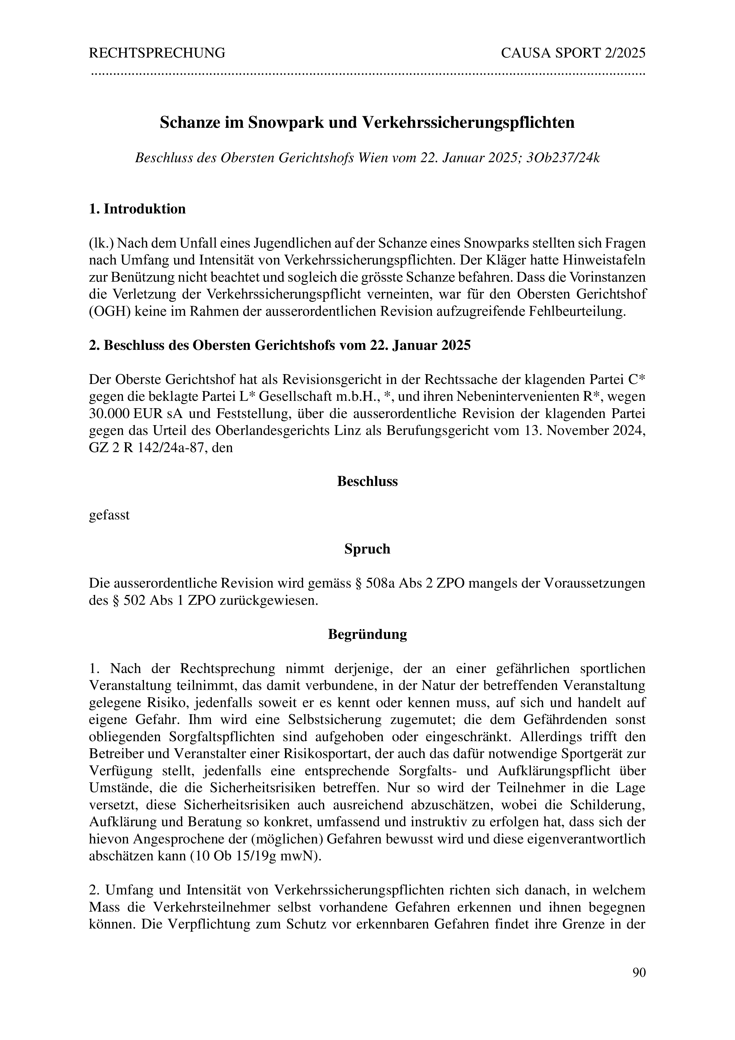 Schanze im Snowpark und Verkehrssicherungspflichten