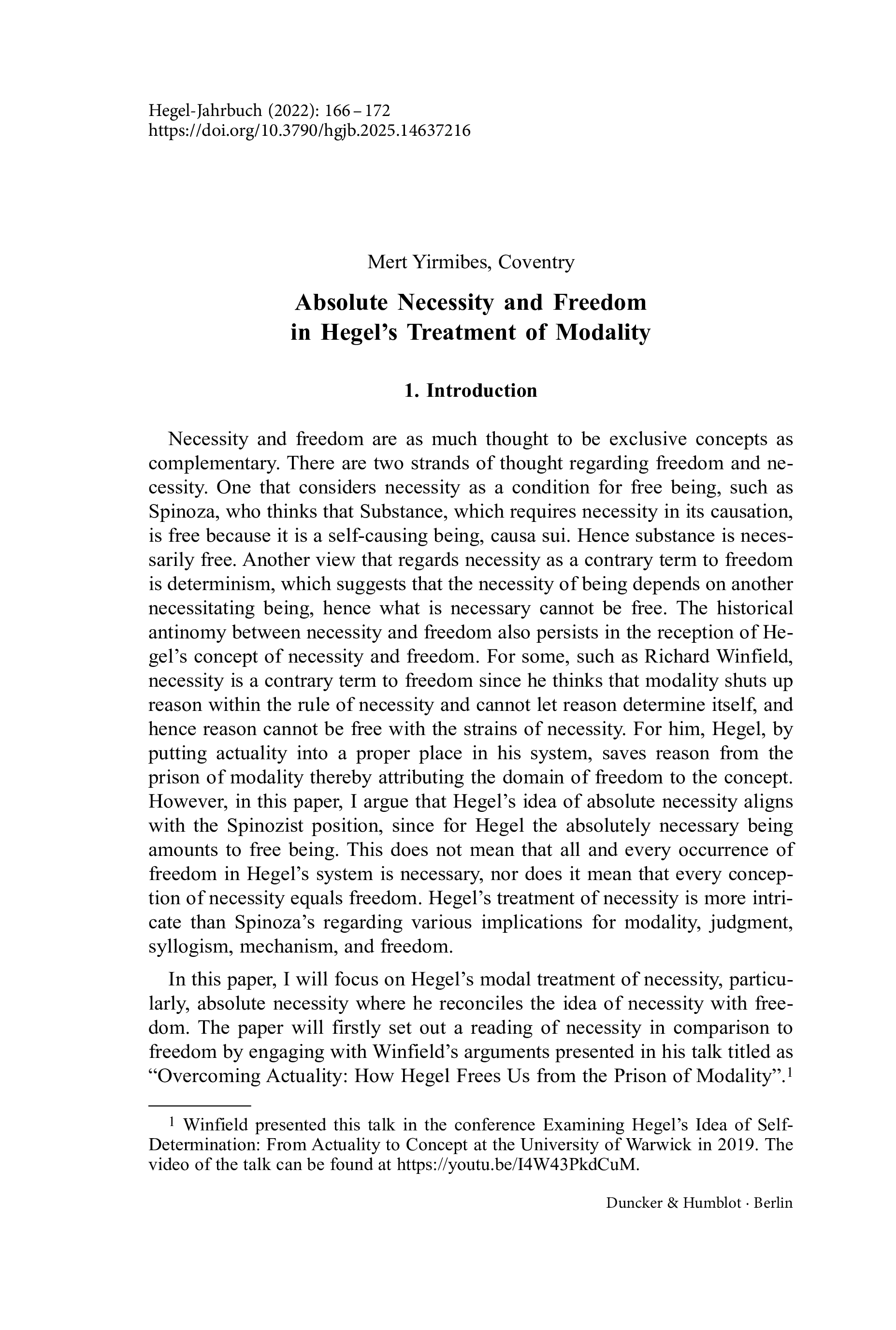 Hegel Jahrbuch, Vol. 2022 (2022), Iss. 1 : pp. 166–172 | First published online: November 14, 2025