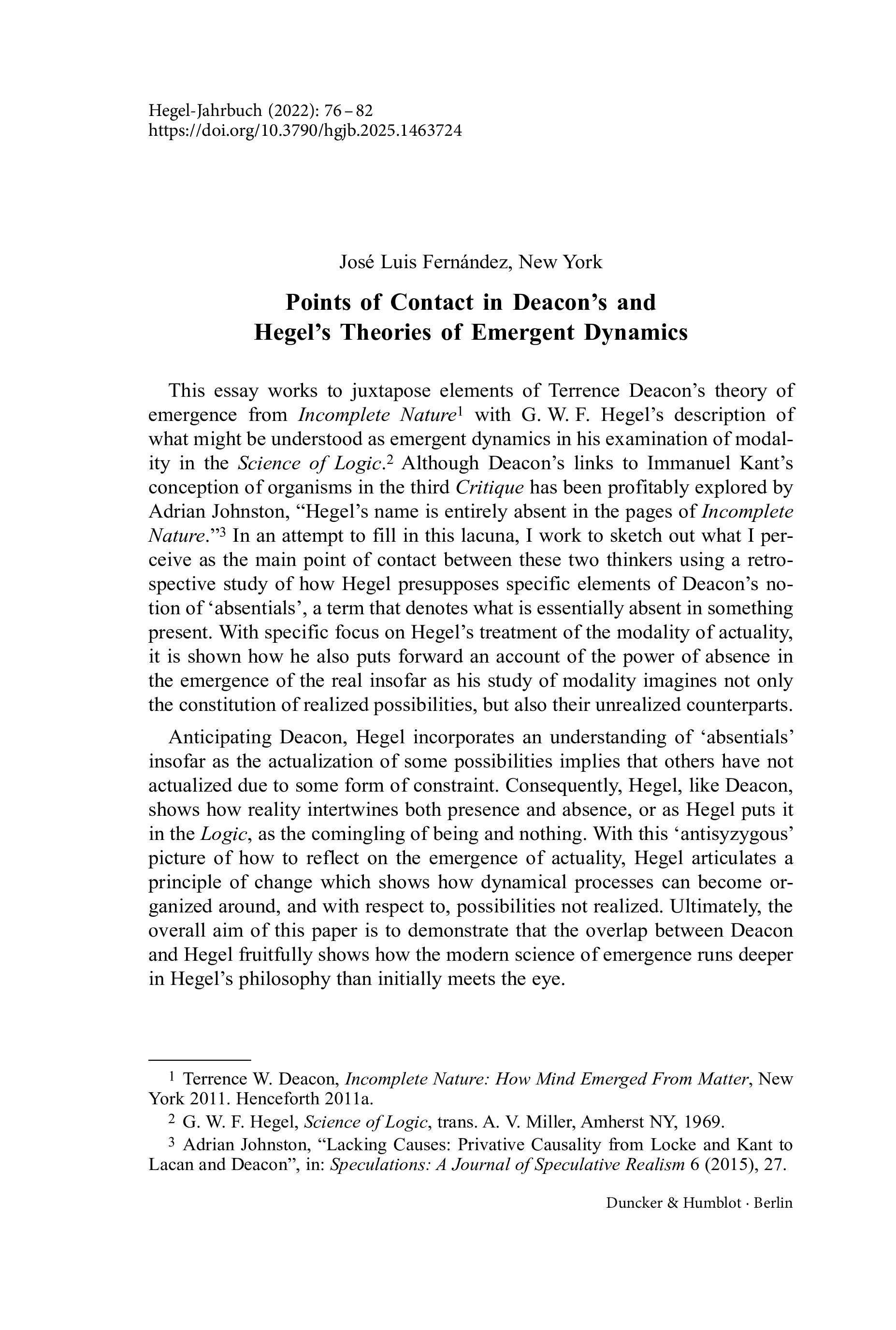 Points of Contact in Deacon’s and Hegel’s Theories of Emergent Dynamics