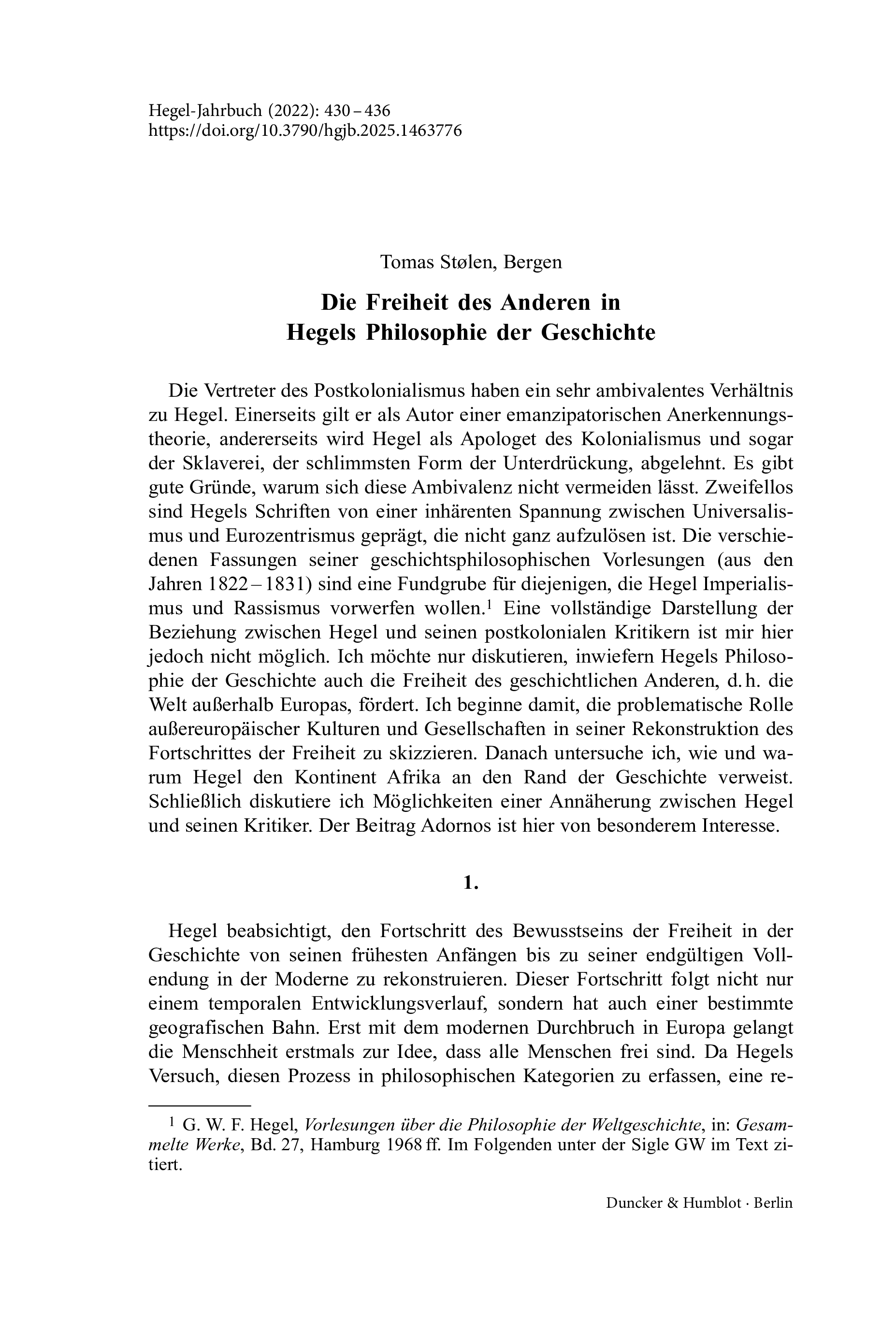 Hegel Jahrbuch, Vol. 2022 (2022), Iss. 1 : pp. 430–436 | First published online: November 14, 2025