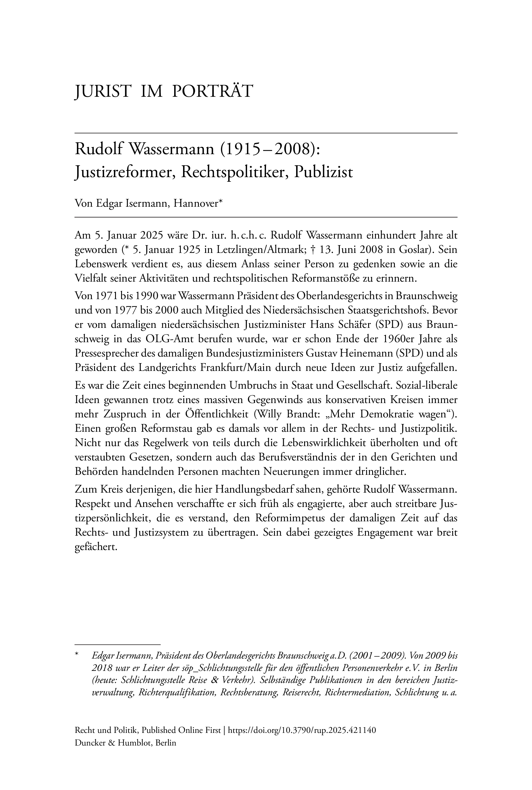 Rudolf Wassermann (1915 – 2008): Justizreformer, Rechtspolitiker, Publizist