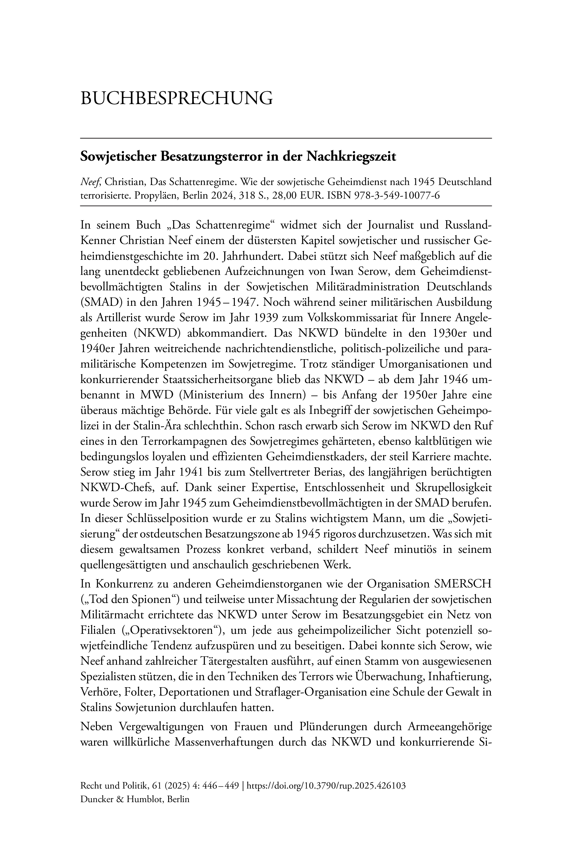 Neef, Christian, Das Schattenregime. Wie der sowjetische Geheimdienst nach 1945 Deutschland terrorisierte. Propyläen, Berlin 2024, 318 S., 28,00 EUR. ISBN 978-3-549-10077-6Recht und Politik, Vol. 61 (2025), Iss. 4 : pp. 446–449 | First published online: December 15, 2025